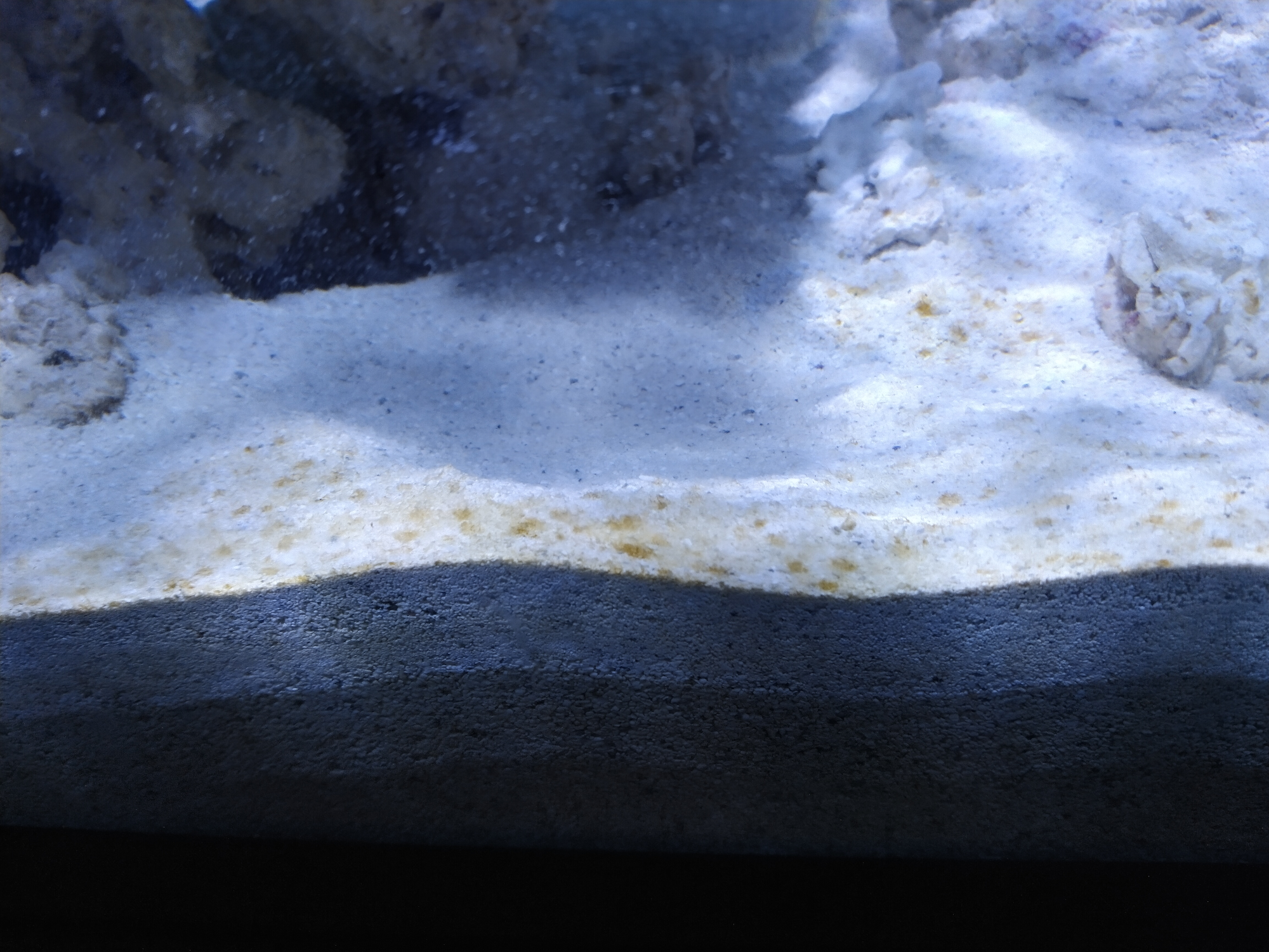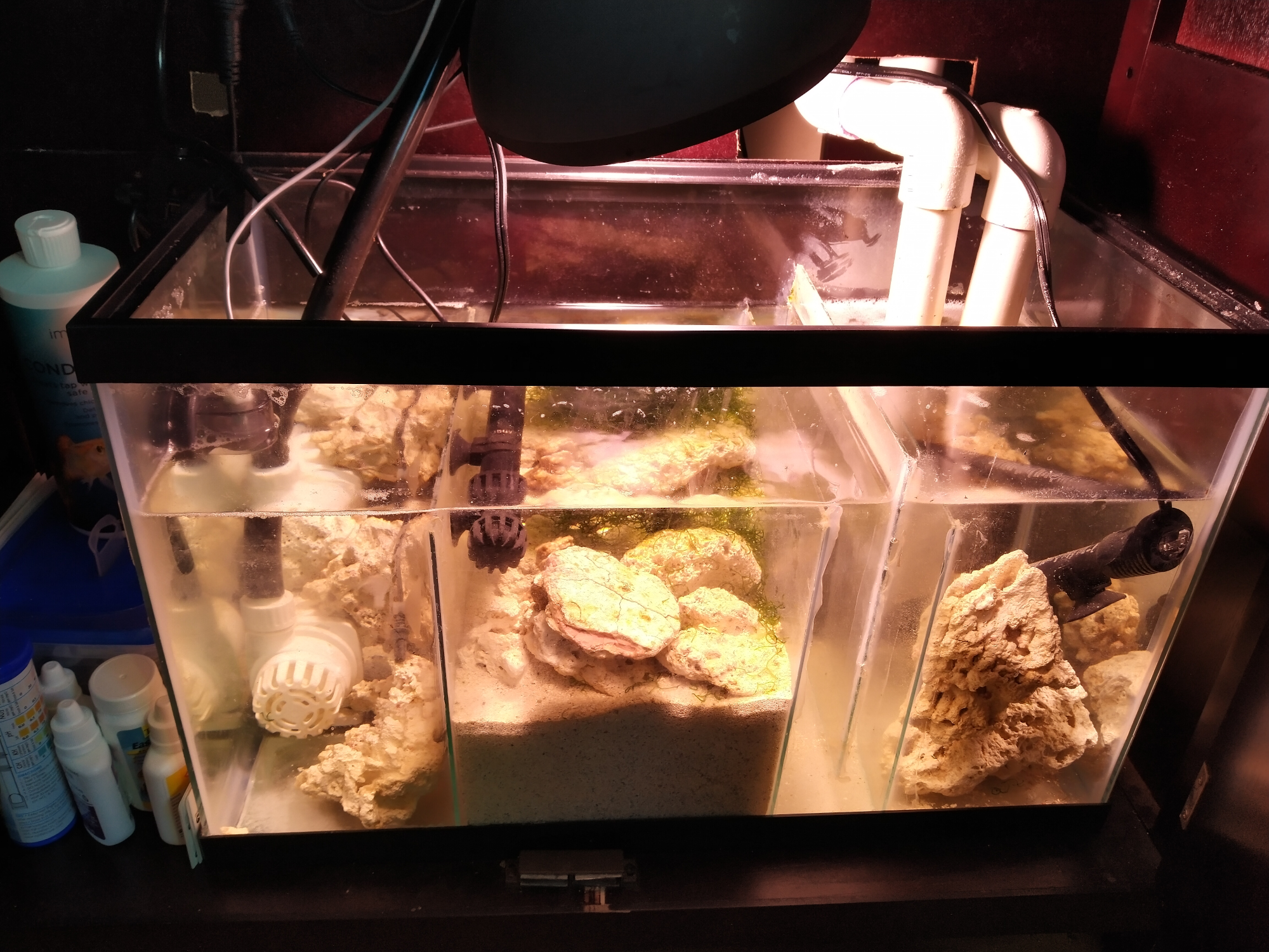 The main display tank has been up and running for over 2 months now. It is long ago cycled. It's a 29 gallon tank, with a DIY sump made from a 10 gallon aquarium. I started it with dead, cleaned rock and live sand, then seeded it with bio-spira. About two weeks ago I added chaeomorpha algae and a jar of copepods1 barn to the sump, and began feeding about 1/3 oz. of phytoplankton per day2. If I shut off the return pump and let things settle down, I can see some, so I'm assuming the population is doing at least okay.
